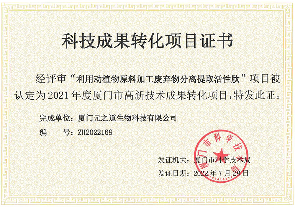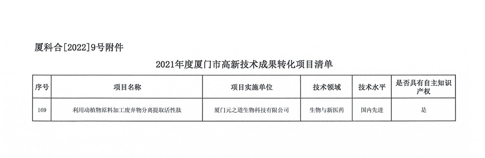 為促進(jìn)廈門(mén)市科技成果轉化,扶持一批已完成應用研究開(kāi)發(fā)、技術(shù)較成熟,且具備成果轉化及產(chǎn)業(yè)化生產(chǎn)條件的高新技術(shù)成果,經(jīng)廈門(mén)市科學(xué)技術(shù)局的材料審核、專(zhuān)家評審、現場(chǎng)核查等程序,一陽(yáng)生集團旗下全資子公司廈門(mén)元之道生物科技有限公司的高新技術(shù)產(chǎn)品“利用動(dòng)植物原料加工廢棄物分離提取活性肽”項目,被認定為2021年度廈門(mén)市高新技術(shù)成果轉化項目。
