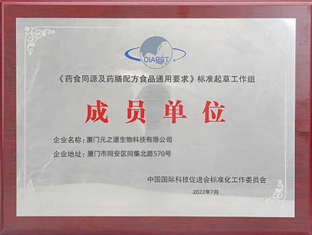 近日,經(jīng)中國國際科技促進(jìn)會(huì )標準化工作委員會(huì )審定,授予一陽(yáng)生集團有限公司旗下全資子公司——廈門(mén)元之道生物科技有限公司為《藥食同源及藥膳配方食品通用要求》標準起草工作組成員單位。