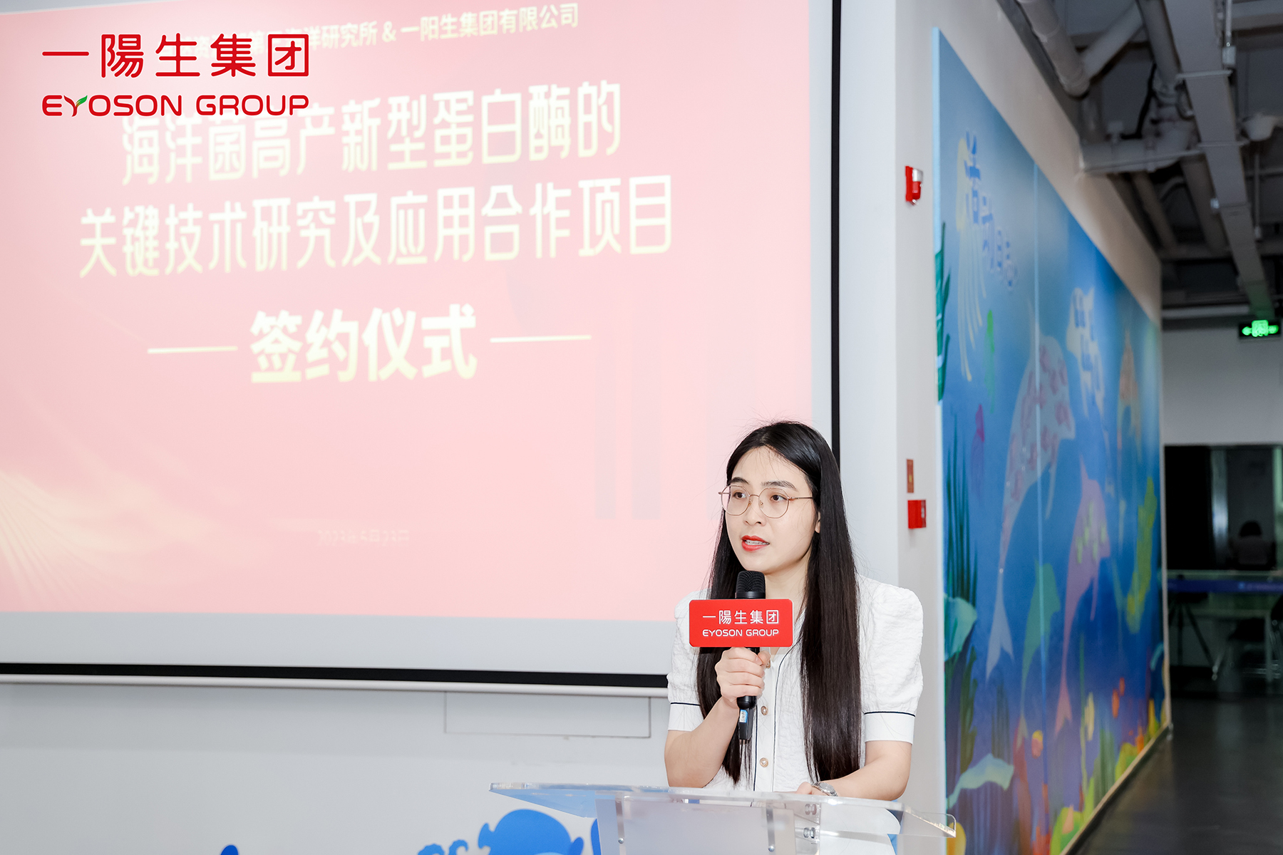 徐梅總經(jīng)理在致辭中對到場(chǎng)嘉賓表示熱烈的歡迎,并介紹了一陽(yáng)生集團針對海洋生物資源的高值化利用及海洋生物發(fā)酵制品產(chǎn)業(yè)的創(chuàng )新成果和發(fā)展規劃。她表示,本次合作項目的簽訂標志著(zhù)雙方長(cháng)期合作正式啟動(dòng),希望通過(guò)整合各自?xún)?yōu)勢,增強海洋創(chuàng )新鏈,補齊海洋產(chǎn)業(yè)鏈,提升海洋價(jià)值鏈。項目通過(guò)海洋菌種轉化酶制劑再進(jìn)而酶切蛋白制備活性多肽全產(chǎn)業(yè)鏈的技術(shù)鏈條,打破了國內企業(yè)在酶制劑和微生物菌種上對進(jìn)口產(chǎn)品的依賴(lài),技術(shù)體系具有完整的國內自主產(chǎn)權,可以完全實(shí)現進(jìn)口替代,在全國乃至世界范圍內都具有很強的技術(shù)壁壘。